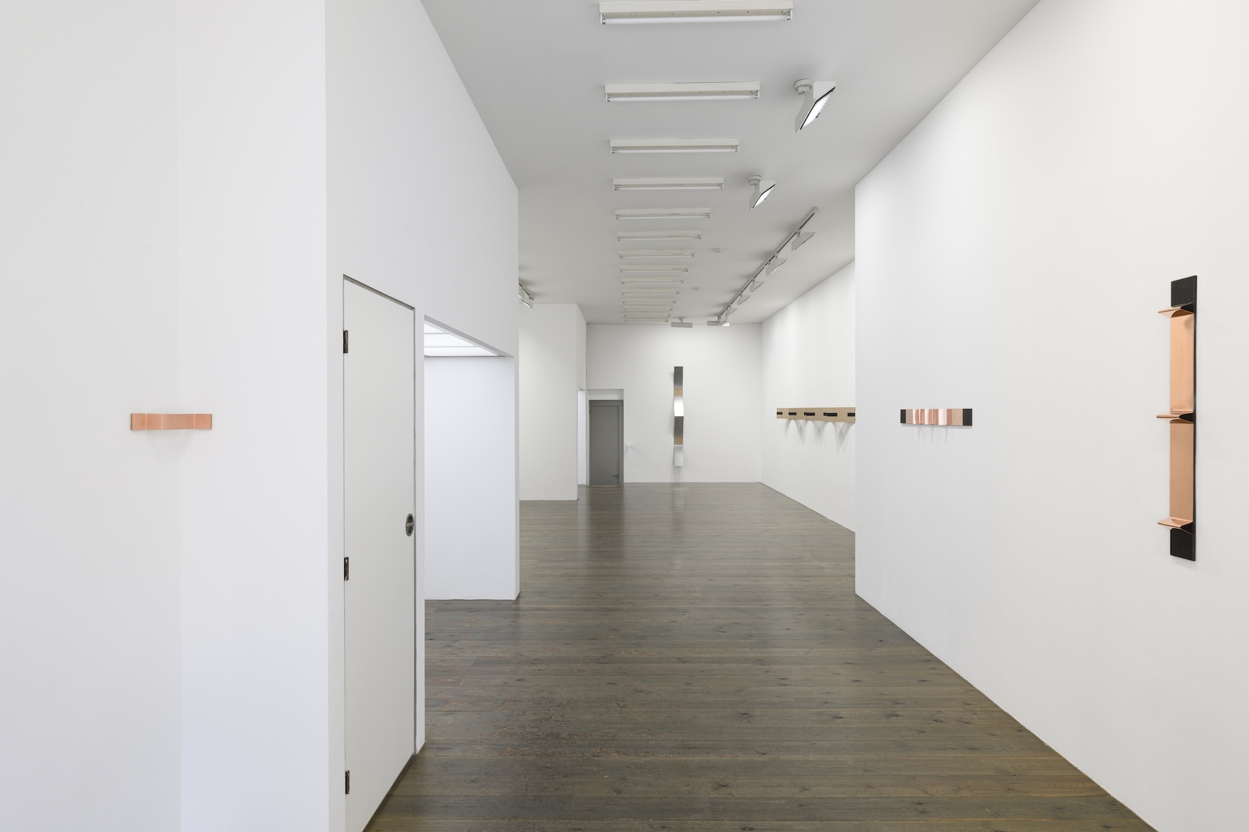 By methods of folding, cutting, pressing and stacking Foxcroft arranges the material on the walls to create a dialogue between the works; her installations thereby make the commonplace aesthetic and the two-dimensional architectural. For her show at Slewe Gallery she will exhibit new works created from MDF, copper and iron. Copper is a new material for her.