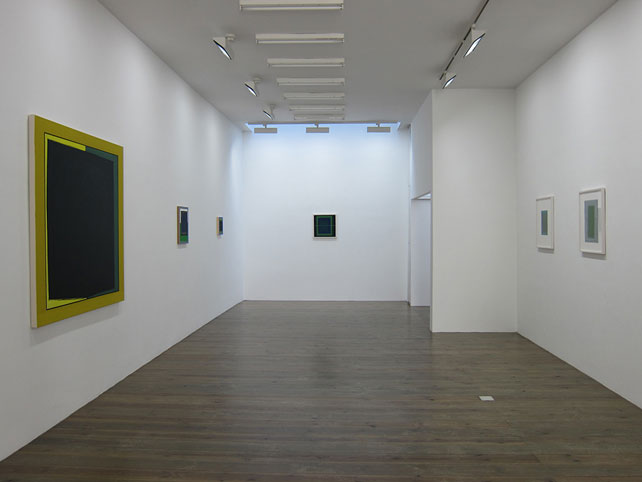 The very refined drawings and paintings by Tuzina show the inheritance of the minimalist idiom of the sixties and seventies. His rectangled drawings in mostly dark blue and green colors look like windows. They are cut by expressive horizontal, vertical and diagonal lines. These lines and angles are not quite perfect, which give them an emotional significance. It contrasts sharply with the anonymous, industrial perfection of Minimal Art.