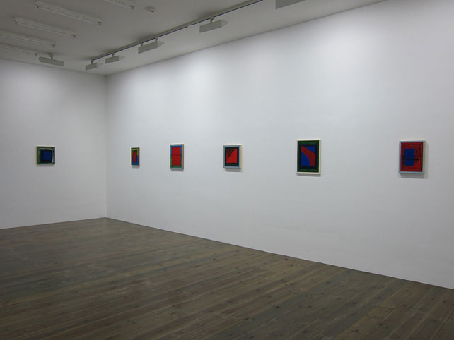 The very refined relatively small paintings by Günter Tuzina show the inheritance of the minimalist idiom of the sixties and seventies. His rectangle sized paintings in mostly dark blue, red and green colors look like windows. They are cut by expressive horizontal, vertical and diagonal lines. These lines and angles are not quite perfect, which give them an emotional significance.
